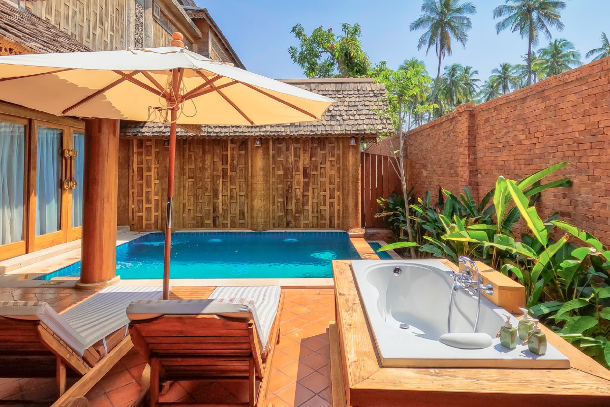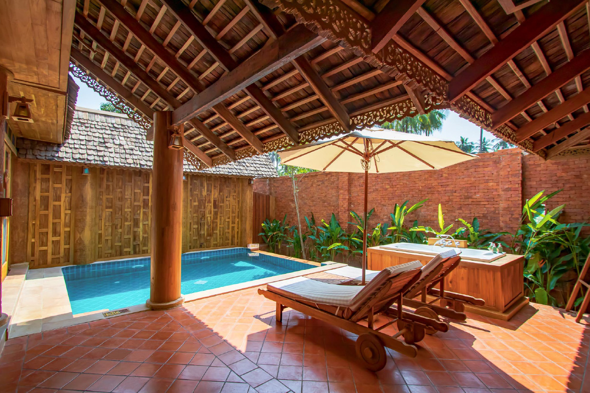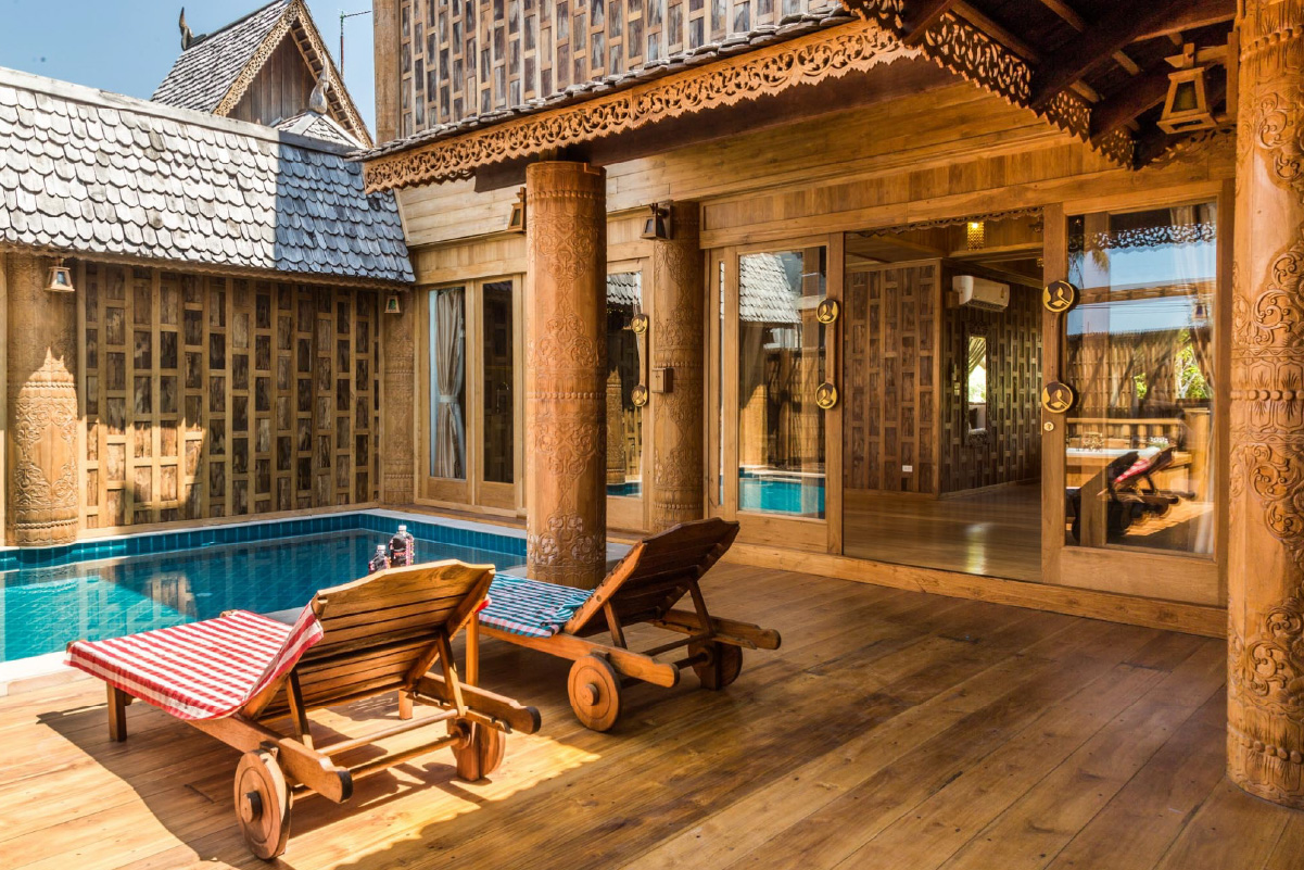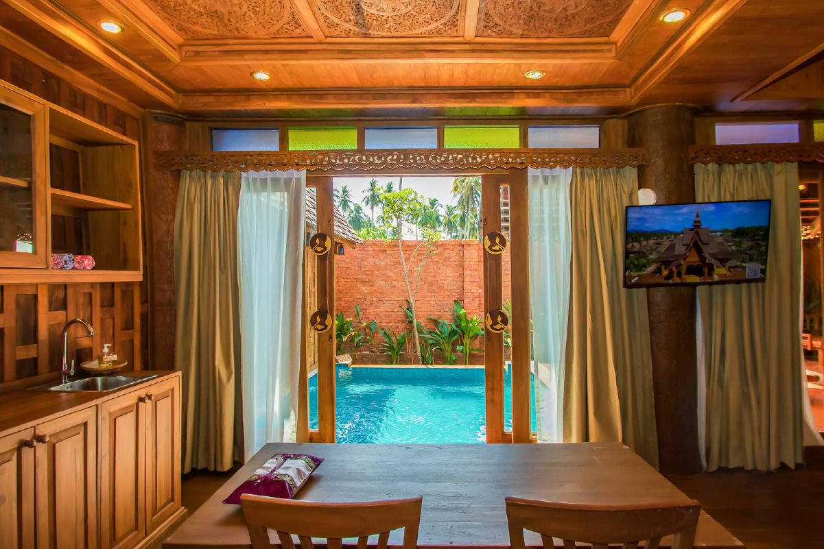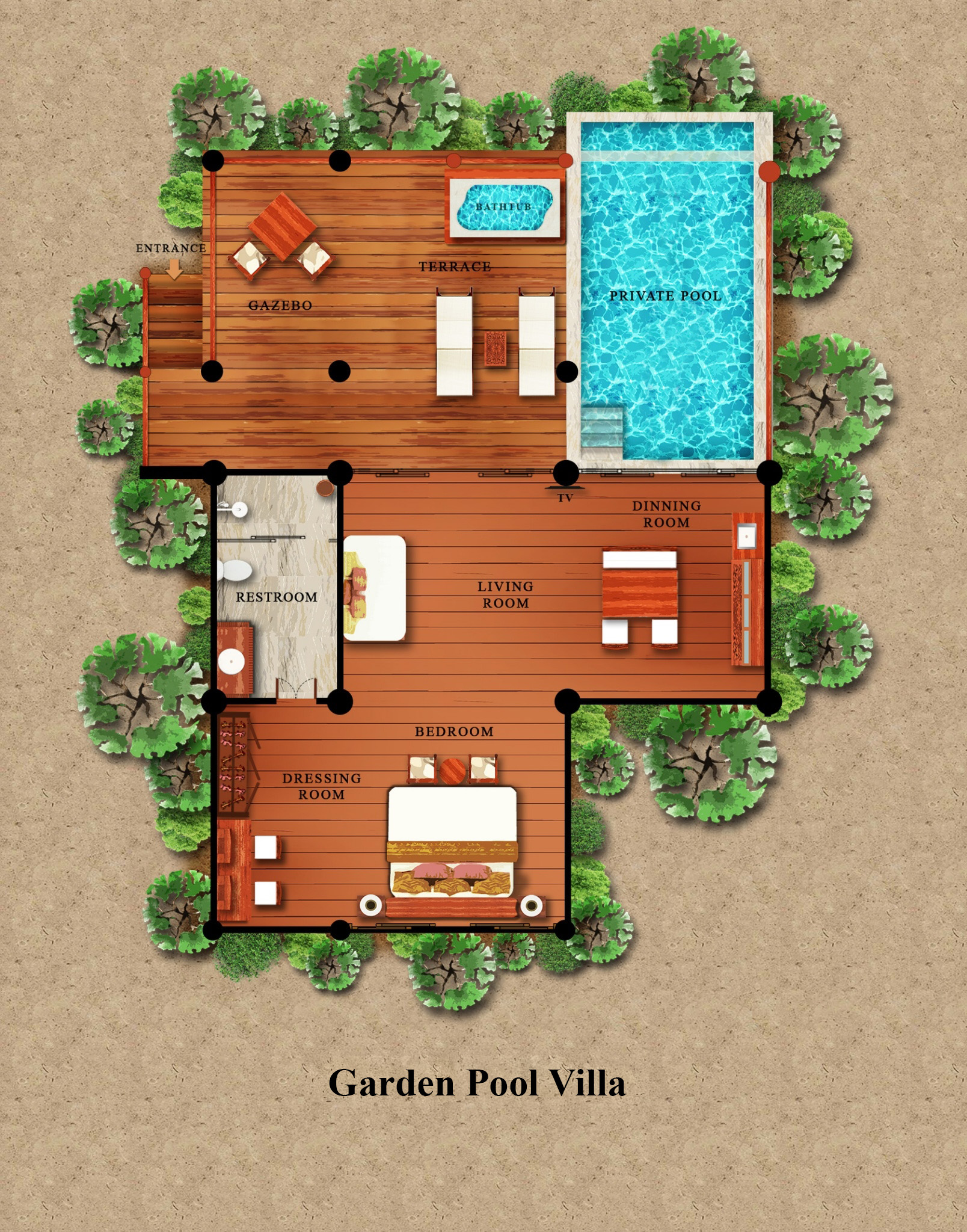 The Garden Pool Villa is a spacious 140 sq.m. room located on the lower level of the 2-story villa, completely separate from the upper floor (Deluxe Pool Villa). Garden Pool Villa seamlessly integrates a private swimming pool and outdoor sunken bathtub, complemented by the aromatic presence of Thai-style teak wood carvings and exquisite fabric decorations. This room guarantees privacy and a luxurious experience, ideal for couples or small families looking for a serene getaway enriched with an oriental ambiance and luxurious comforts.