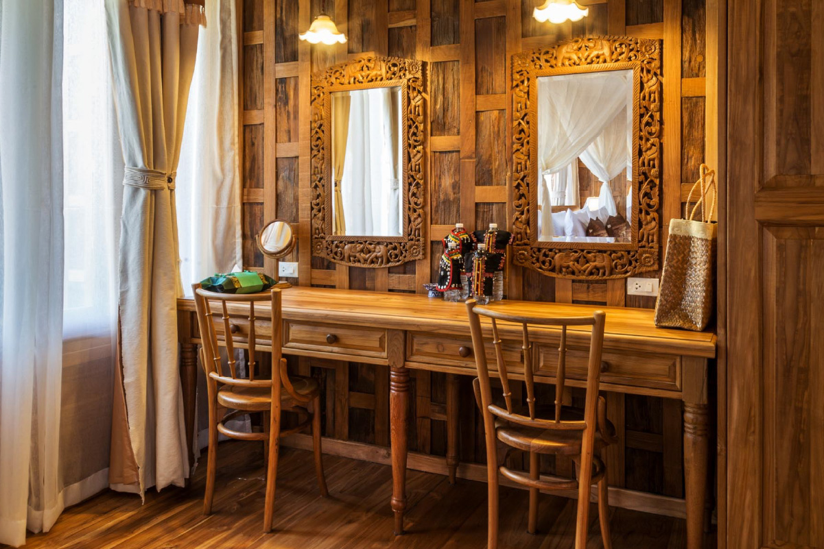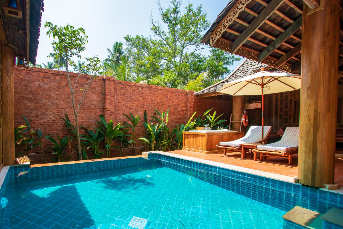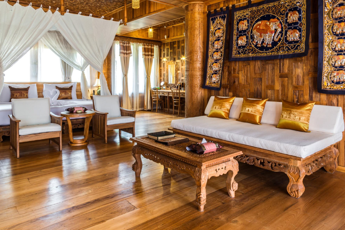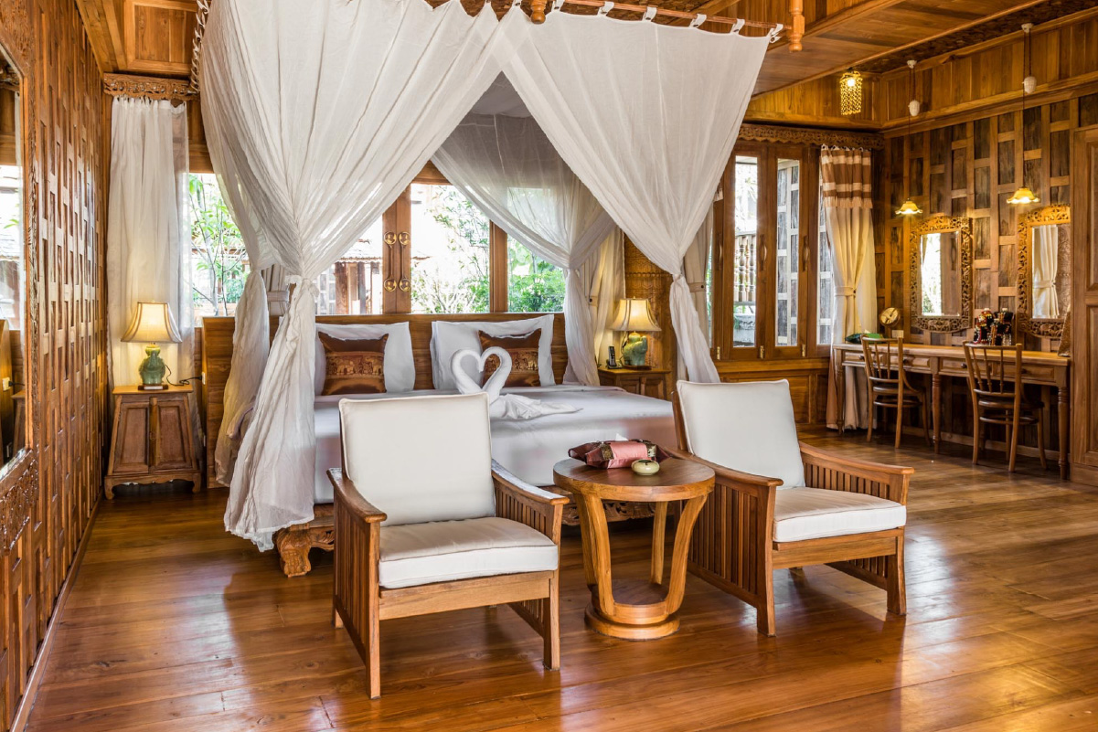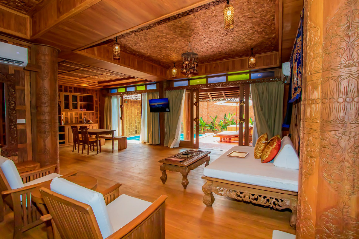 The Garden Pool Villa is a spacious 140 sq.m. room located on the lower level of the 2-story villa, completely separate from the upper floor (Deluxe Pool Villa). Garden Pool Villa seamlessly integrates a private swimming pool and outdoor sunken bathtub, complemented by the aromatic presence of Thai-style teak wood carvings and exquisite fabric decorations. This room guarantees privacy and a luxurious experience, ideal for couples or small families looking for a serene getaway enriched with an oriental ambiance and luxurious comforts.