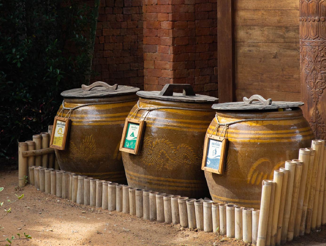 Our waste stations, created from famous Thai ceramic jars, offer an elegant and intuitive way to manage waste. The natural earth tones and subtle textures of the ceramic blend seamlessly with the resort’s wooden architecture, encouraging mindful disposal while supporting eco-conscious living throughout the resort.